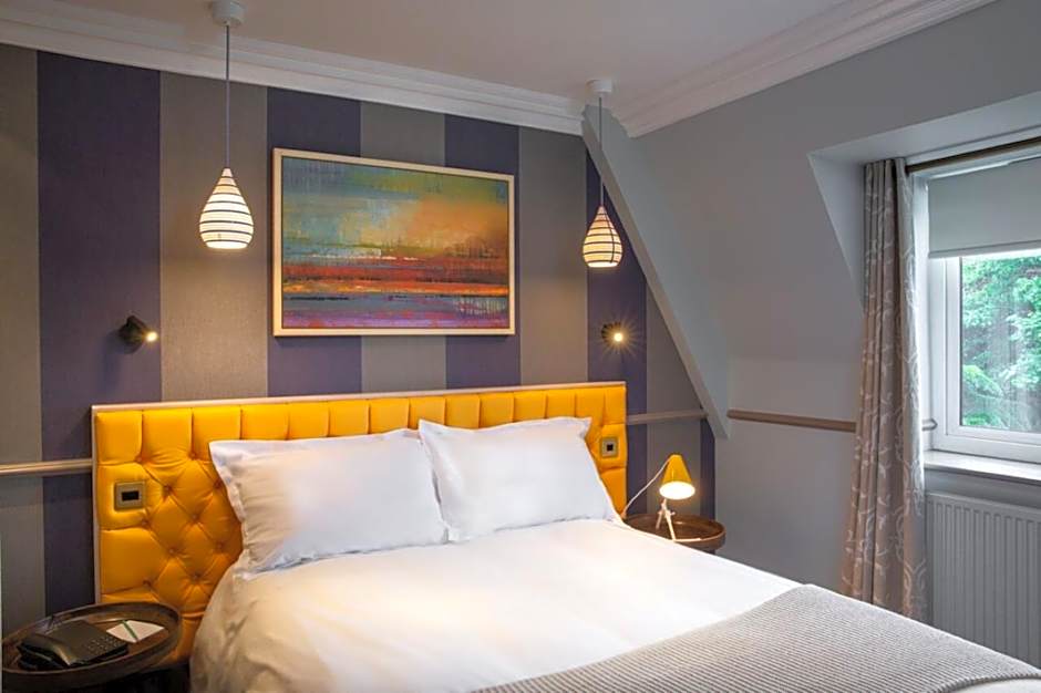 This room with attached bathroom features a view of the hotel's private garden.